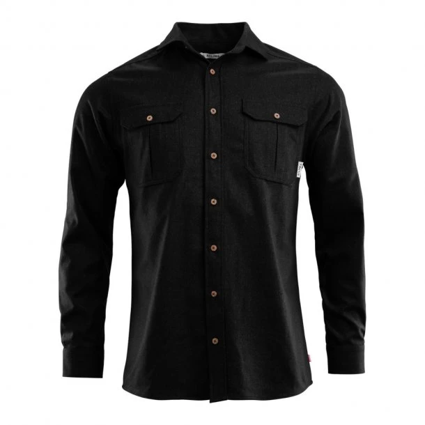 Uldskjorten er udviklet med to brystlommer forpå, som lukkes med en knap. Hertil åbnes og lukkes denne model med knapper forpå, og manchetterne er udviklet med to knapper.