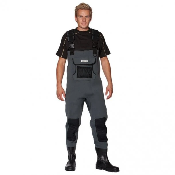 Komfortabel neopren waders som er fremstillet i høj kvalitet af det danske firma Ocean. Neopren sikrer en god isolering og bevægelsesfrihed, som gør den velegnet til fiskeren elle biologen. På fronten har wadersene en lomme til opbevaring af dit udstyr eller værdigenstande. Knæene er desuden forstærkede med gummi for at forlænge levetiden. Gummistøvler er velegnet til brede fødder.