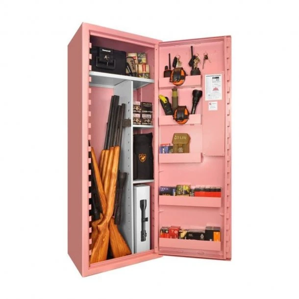 SP88 Våbenskab med Kodelås (Lyserød) fra Scandinavian Safe er fremstillet med plads til 9 våben og med kodelås. Stiger i begge sider af skabet muliggør hylder fra top til bund. Kan også bruges til opbevaring af fotoudstyr og bærebare computere. Flytbar tophylde, 5 hylder i dør samt nøglekroge medfølger. Skabet findes også i en version med nøglelås. Sidepanel med 2 hylder medfølger. Våbenskabet er godkendt af Danske Forsikring og Pension og SS4392 standard. Våbenskabet sendes med fragtmand direkte fra leverandøren.