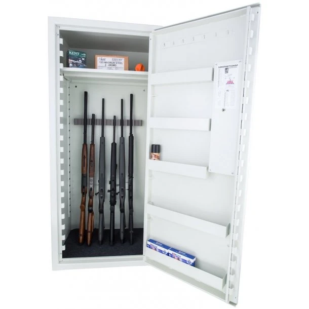 Våbenskab med plads til 16 våben og med kodelås. Stiger i begge sider af skabet muliggør hylder fra top til bund. Kan også bruges til opbevaring af fotoudstyr og bærebare computere. Flytbar tophylde, 5 hylder i dør samt nøglekroge medfølger. Skabet findes også i en version med nøglelås. Våbenskabet er godkendt af Danske Forsikring og Pension og SS4392 standard. Våbenskabet sendes med fragtmand direkte fra leverandøren.